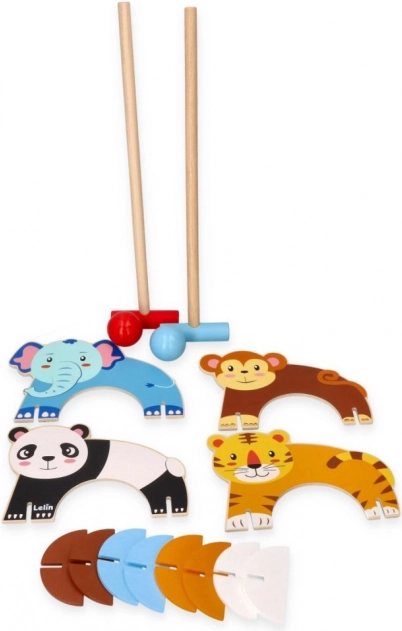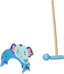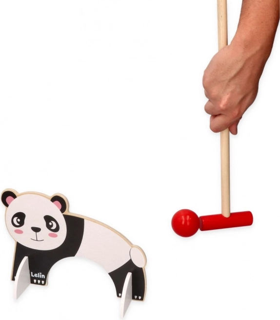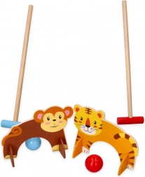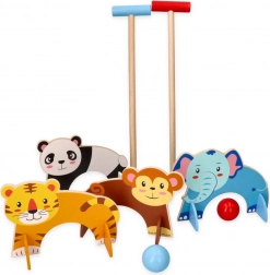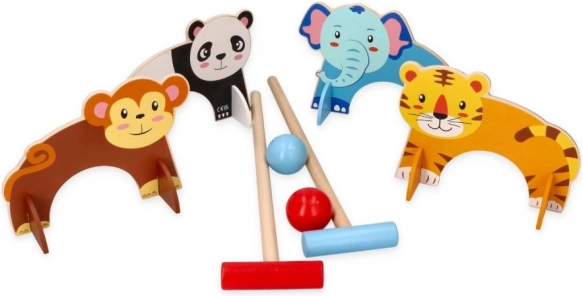 Tento dřevěný kroketový set je ideální pro malé děti, které si chtějí užít venkovní zábavu. Hra zahrnuje barevné malety a koule, přičemž každá branka má svůj zvířecí motiv, což vytváří interaktivní a imaginativní herní zážitek.