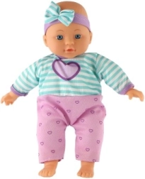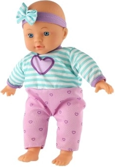 Panenka je oblečená do atraktivního oblečku s motivy srdíček a doplněna o roztomilou mašli, což z ní dělá stylovou kamarádku pro děti.