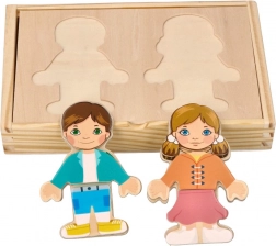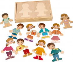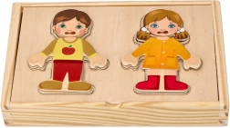 Tato dřevěná magnetická skládačka s postavičkami chlapce a dívky nabízí desítky možností, jak je obléknout a kombinovat jednotlivé dílky. Děti při hře trénují koordinaci oko–ruka, logické myšlení i vnímání tvarů a barev.