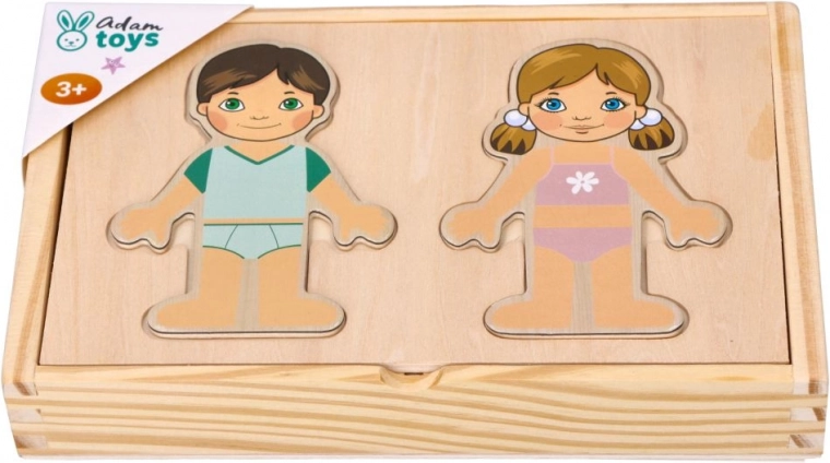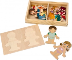 - Postavičky chlapce a dívky s výměnnými magnetickými dílky oblečení, dřevěná krabička/podložka
