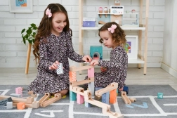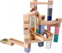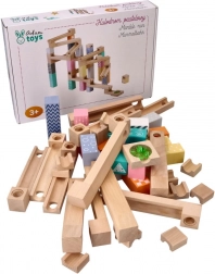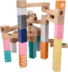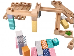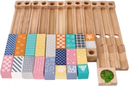 Tento kvalitní dřevěný kuličkodrom v jemných pastelových barvách umožňuje dětem stavět originální dráhy a sledovat, jak kuličky sviští po žlábcích, mostech a otvorech. Odolné dřevěné kostky s tištěnými vzory přinášejí stabilitu i vizuální atraktivitu a rozvíjejí prostorovou představivost.