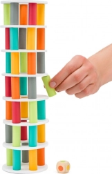 Kostka určuje barvu dílku, který se má vytáhnout či přidat. Každý tah prověří šikovnost i nervy – kdo udrží věž déle v rovnováze?