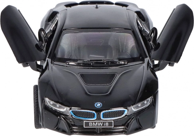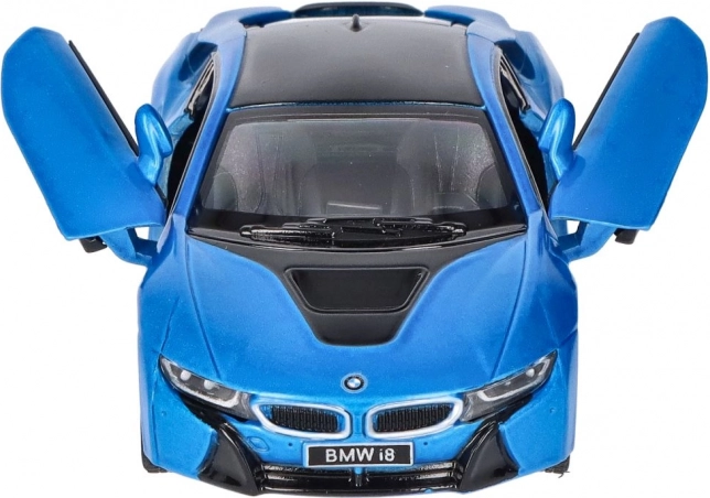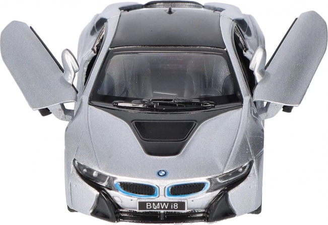 Detailní provedení kovového modelu BMW i8 zahrnuje přesné designové prvky, jako je charakteristická mřížka BMW a tvar světlometů.