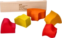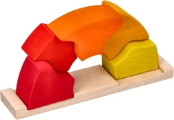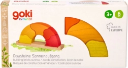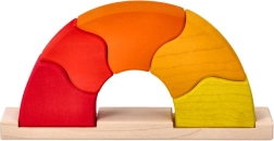 Dřevěná skládačka Východ slunce od značky GOKI nabízí dětem i rodičům radost z objevování. Barevné oblouky v odstínech žluté, oranžové a červené se skládají na dřevěnou základnu, kde vybízejí k experimentování, stavění a volné tvůrčí hře. Hračka přirozeně rozvíjí koordinaci oko–ruka, trpělivost a základní principy rovnováhy.