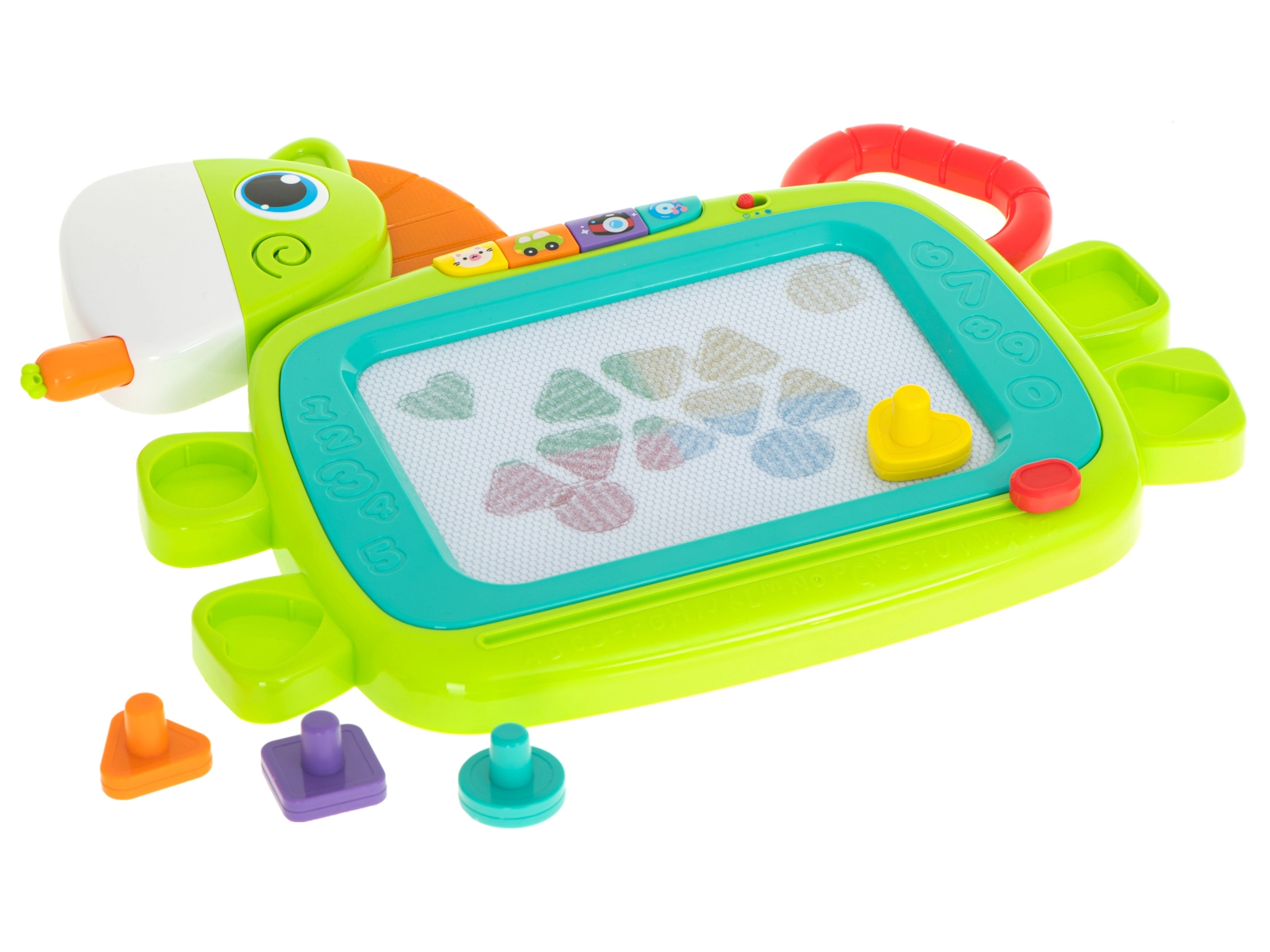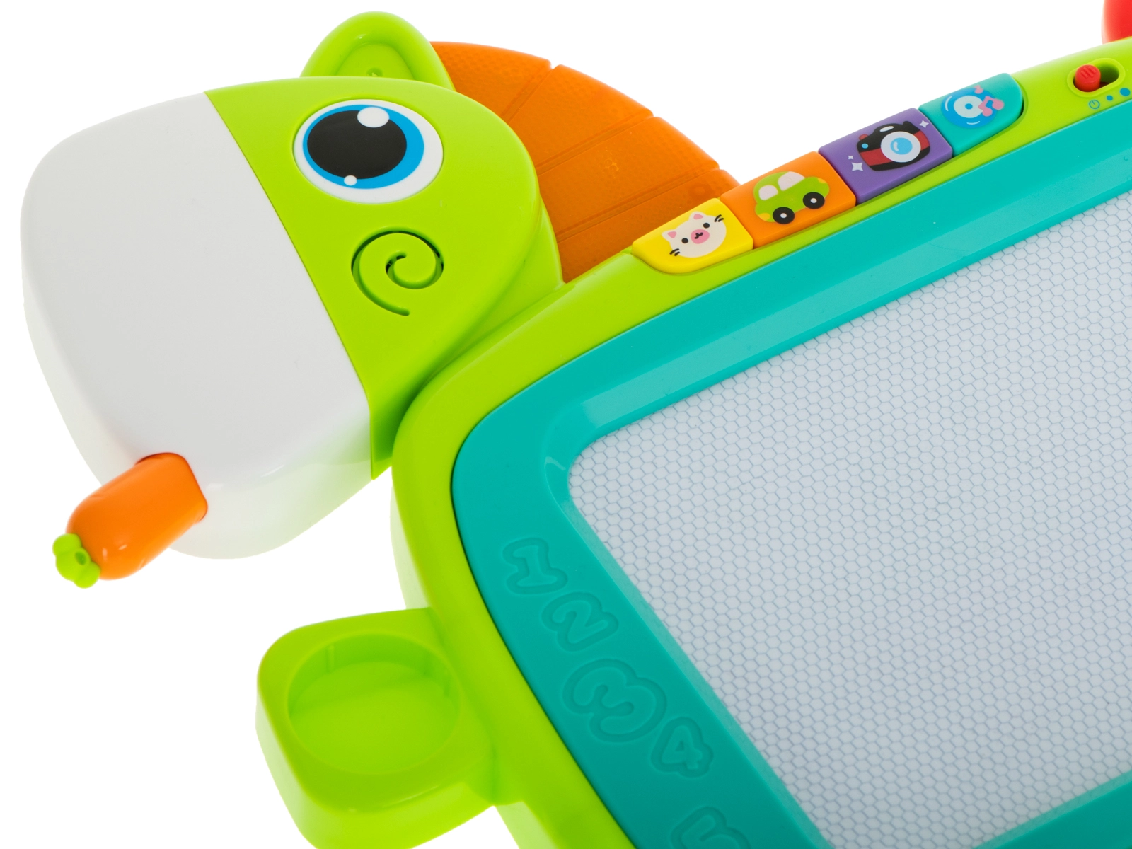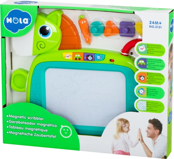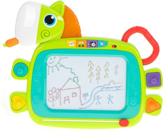 Magnetická tabulka HOLA je skvělá volba pro rozvoj kreativity a jemné motoriky. Díky čtyřem barevným zónám vznikají obrázky v barvách, které děti baví. Jedním tahem posuvníku plochu vymažete a je připravena na další nápady. Tvar koníka s svítící hřívou a veselými zvuky motivuje děti ke hře.