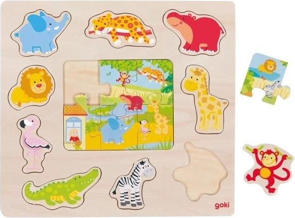 Dřevěná vkládačka pro malé děti s motivem zvířátek ze zoo nabízí 9 vkládacích obrázků a puzzle s 6 dílky. Ideální pro rozvoj dětské koordinace a myšlení.