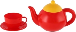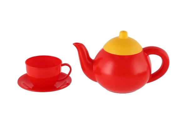 Červená konvice a čtyři barevné hrníčky s podšálky umožní připravit a „podávat“ čaj celé rodině nebo kamarádům.