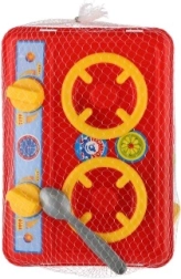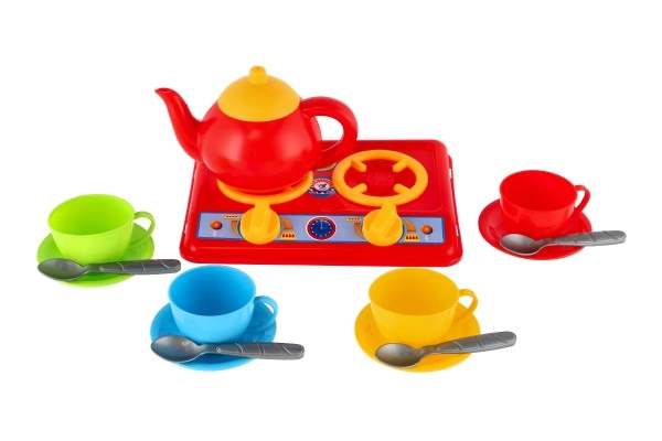 Tato barevná sada pro malé kuchaře přináší vše, co je potřeba k zábavnému vaření a servírování. Kompaktní plastový vařič s ovládacími knoflíky doplňuje červená konvice a čtyři hrníčky se saucerem a lžičkami – ideální pro dětské čajové dýchánky.