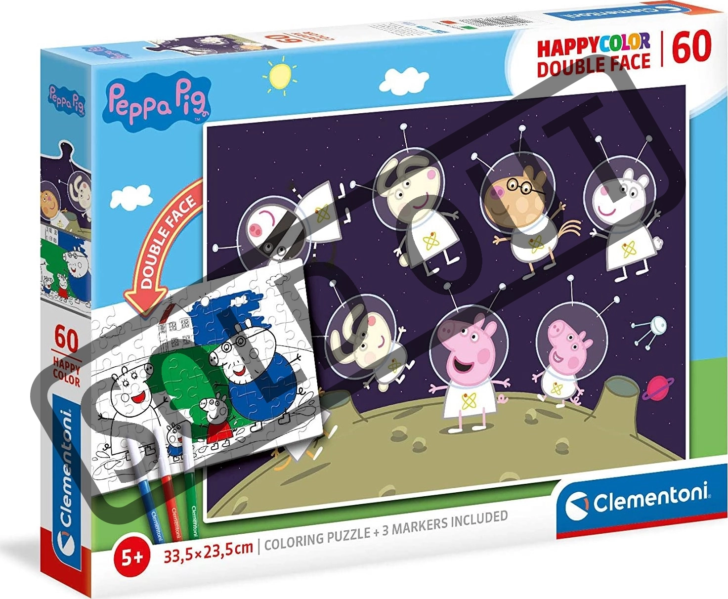 Užijte si kreativní zábavu s oboustranným puzzle Peppa Pig ve vesmíru. Jedna strana nabízí klasický barevný motiv ke složení, druhá strana je černobílá omalovánka, kterou si děti mohou samy vybarvit podle fantazie. Ideální dárek pro malé fanoušky Peppy a vesmírných dobrodružství.