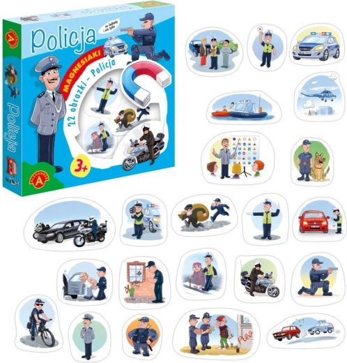 Objevte zábavnou a vzdělávací sadu magnetických obrázků s policejní tematikou od značky ALEXANDER. Balení obsahuje 21 barevných magnetů, které lze snadno připevnit na lednici a jiné kovové povrchy, stejně jako používat na stole či podlaze. Díky velkým rozměrům, pevné kartonové konstrukci a snadno omyvatelnému povrchu jsou ideální pro malé dětské ruce a každodenní hraní.