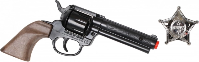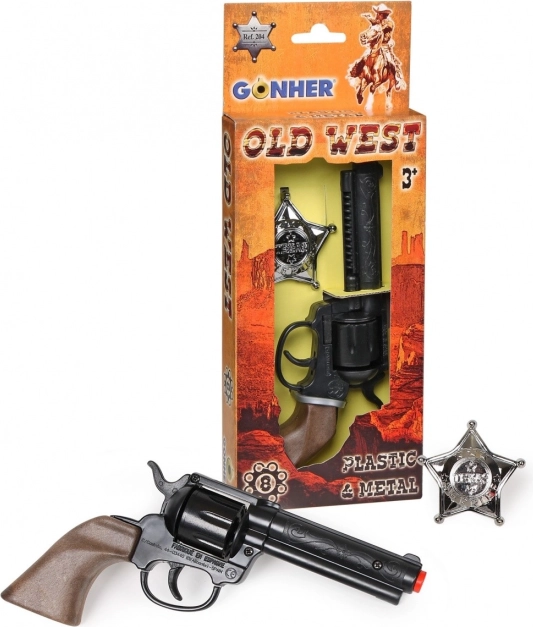Udělejte radost malým odvážlivcům stylovým doplňkem do hry na Divoký západ. Tento dětský kovbojský revolver na 8 nábojů je doplněn o odznak šerifa, takže si děti mohou užít realistickou a bezpečnou zábavu v roli strážců zákona.