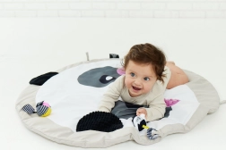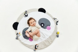 Objevte měkkou a bezpečnou smyslovou podložku pro miminka s motivem pandy od GAGAGU. Kontrastní černo-bílé vzory podporují zrakový vývoj, různé textury na uších a tvářičkách rozvíjejí hmat a všitý šustivý materiál stimuluje sluch. Podložka je bez plastových dílů, příjemně měkká a hustá pro tepelný komfort, s praktickými smyčkami pro připevnění dalších hraček.