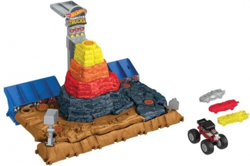 Součástí je legendární HOT WHEELS Bone Shaker a tři autíčka určená ke „zmačkání“ na tribunách.