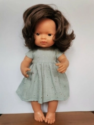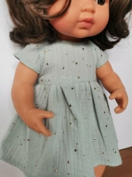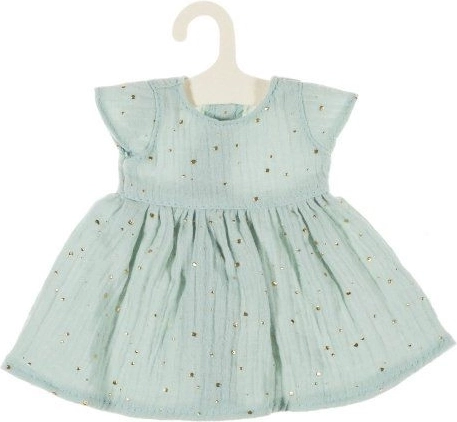 Stylové mušelínové šaty pro panenku o výšce 38 cm v jemné mentolové barvě. Vyrobeno v Polsku z příjemného materiálu s certifikací CE. Snadná údržba – lze žehlit na nízkou teplotu, ideálně ošetřit párou, aby si látka zachovala svou jedinečnou texturu. Vhodné pro děti od 3 let.