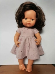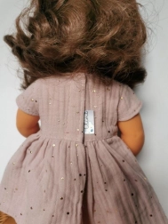 Roztomilé mušelínové šaty pro panenky o velikosti 38 cm v něžné růžové barvě. Vyrobeno v Polsku z příjemného materiálu s jemnou strukturou. Snadná údržba – lze žehlit při nízké teplotě, ideálně ošetřit párou, aby si látka zachovala svoji fakturu. Vhodné pro děti od 3 let a splňuje CE.