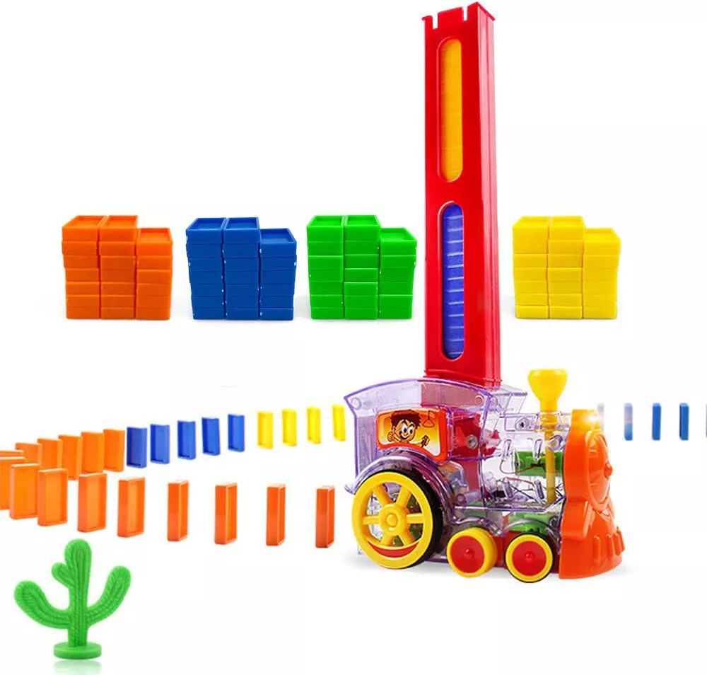 Tato chytrá lokomotiva s podavačem kostek sama pokládá domino do úhledné řady. Směr jízdy jednoduše nastavíte komínkem, zatímco efektní světla a zvuk zvonku dělají ze hry poutavou podívanou. Děti mohou vytvářet složité dráhy a poté je s radostí jedním pohybem bořit.