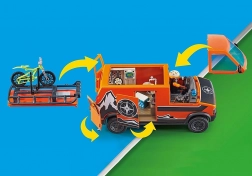Oranžová off-road dodávka s agresivním vzhledem, střešním nosičem a grafickými prvky hor je středobodem celé výpravy. Připravená na každou trasu a plná detailů pro realistickou hru.