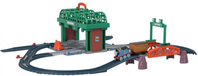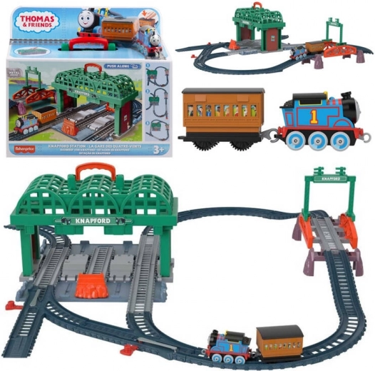 - Stanice Knapford s úložným panelem a madlem, díly kolejí, most, nadjezdové značení, mašinka Tomáš (push‑along), osobní vagónek s cestujícími