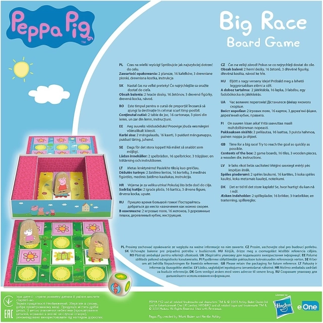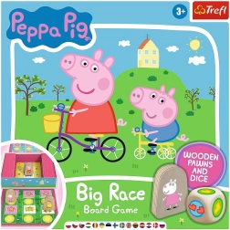 Big Race (Velký závod) je veselá a jednoduchá stolní hra s licencí Prasátko Peppa, ve které děti zažijí své první výhry i prohry. Házejte velkou dřevěnou kostkou, posouvejte své dřevěné figurky po barevném plánu a odhalujte kartičky se zvláštními akcemi – extra hod, výměna figurky, krok vpřed nebo zpět. Cíl je jasný: být první, kdo opustí herní plán, a vyhrát velký závod!