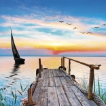 Scéna s molem, plachetnicí a západem slunce podporuje relaxaci a přináší do domova atmosféru ticha a pohody.