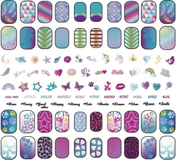 Barevné laky, umělé nehty a tematické samolepky pro kreativní mix motivů od hvězdiček po pruhy a gradienty.