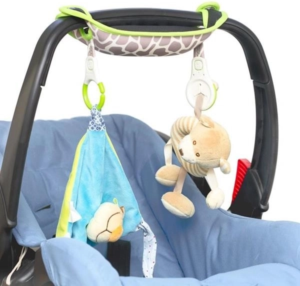 Díky houpacím klipům snadno připnete dudlík nebo oblíbenou hračku, takže je má dítě stále po ruce. Instalace je rychlá a intuitivní – jednoduše omotáte a zajistíte. Univerzální velikost pasuje na většinu madel dětských autosedaček.