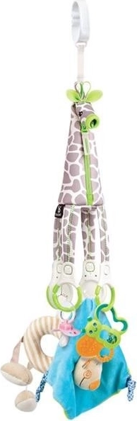 Roztomilý závěsný organizér ve tvaru žirafy udrží dětské drobnosti vždy po ruce. Má 4 bezpečné háčky na připevnění hraček, praktickou kapsu v bříšku na dudlík či svačinku, zrcátko pro zábavu a nastavitelný popruh pro snadné zavěšení na kočárek nebo hrazdičku. Vhodné od narození.