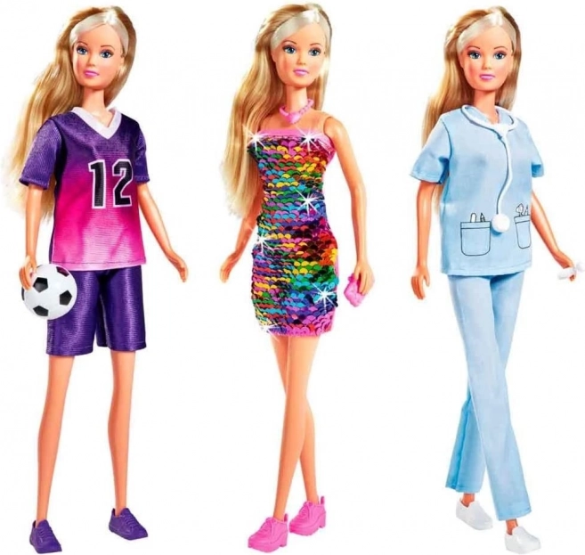 Objevte kouzlo hraní s panenkou Steffi Love a třemi stylovými outfity. V balení najdete třpytivé šaty s měnícími se flitry, lékařský komplet a fotbalový dres – to vše doplněné praktickými doplňky pro ještě větší zábavu. Ideální volba pro děti, které milují převlékání a kreativní příběhy.