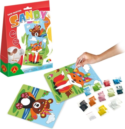 Obsah balení: 2 předlohy (liška a medvěd), 22 sáčků s barevným pískem (2 × 11), 1 sáček s brokátem, dřevěná špachtle, papírová podložka, návod.