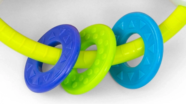 Měkký kousací prvek pomáhá při prořezávání zoubků a zároveň poskytuje bezpečnou texturu pro zkoumání ústy.