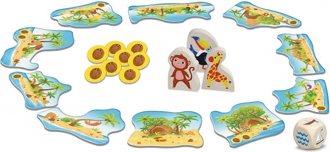 - 9 ostrovů, 1 pevnina, 8 kokosů, 3 dřevěné figurky, 1 velká dřevěná kostka, Průvodce pro rodiče