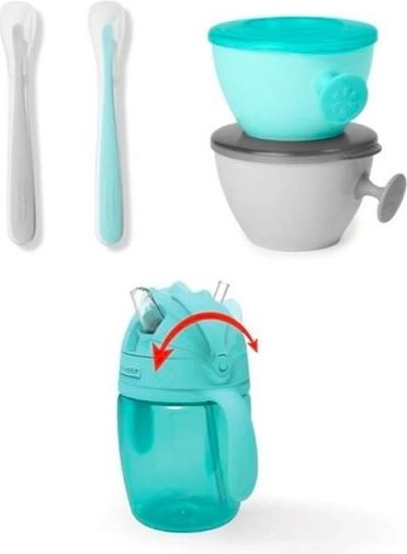 - Obsahuje dvě misky s víčky, dvě lžičky a hrníček se slámkou
