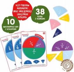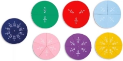 Součástí sady jsou dřevěné elementy znázorňující zlomky 1/2, 1/3, 1/4, 1/5, 1/6, 1/8 a 1/10, které doplňují odpovídající pracovní karty. Děti procvičují rozpoznávání zlomků, vizuální srovnávání a logické myšlení.