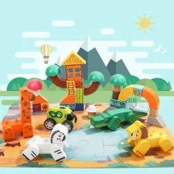 Připojte se k Safari dobrodružství a vytvořte si vlastní zábavní park. Sada obsahuje puzzle pro stavbu parku s jezírkem a keři.