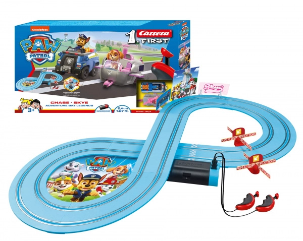 Objevte svět závodění s autodráhou Carrera First Tlapková patrola. Díky přehlednému ovládání a odolnému provedení je tato autodráha perfektní pro malé závodníky. Dvě detailně zpracovaná autíčka Chase a Skye se díky magnetům a kontaktním kartáčkům skvěle drží na trati, zatímco točící vrtule dodají jízdě napětí a zábavu.