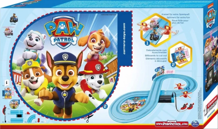 Zábavná autodráha pro nejmenší s hrdiny ze seriálu PAW PATROL přináší 2,4 m dlouhou trať, dvě vozidla Chase a Skye, jednoduché ovladače na baterie a hravé prvky včetně točících vrtulí. Ideální první závodní set pro děti od 3 let s kvalitním zpracováním CARRERA.