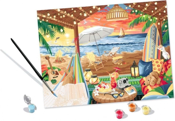 Vše máte připravené k okamžitému tvoření – stačí otevřít balení a začít malovat. Očíslované kelímky s akrylovými barvami na vodní bázi se snadno zavírají, aby barvy nevysychaly, a kvalitní štětec s jemnou špičkou zvládne i drobné detaily motivu pláže.