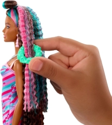Krepované prameny s růžovými a tyrkysovými proužky lákají k česání, zaplétání a zdobení – ideální pro kreativní hry s účesy.