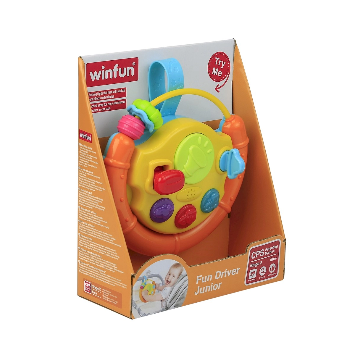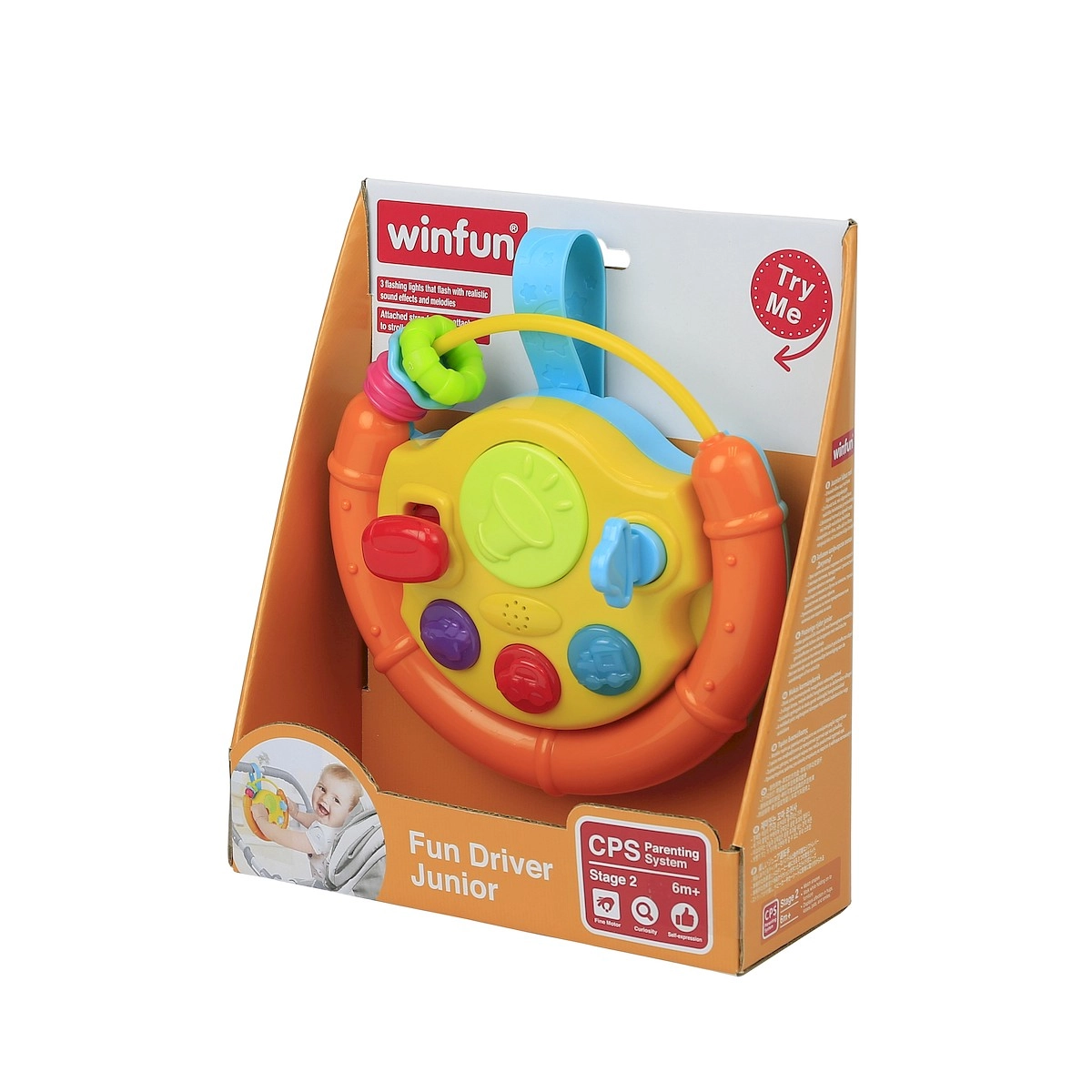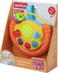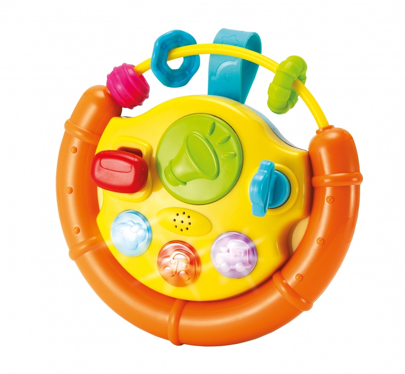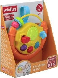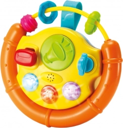 Tento barevný volant je ideální aktivizační hračka pro nejmenší. Děti zaujmou blikající světýlka, veselé melodie a různé hmatové podněty. Pohyblivé součásti jako kulička, autíčko či rybka lákají ke zkoumání a procvičují úchop i koordinaci oko–ruka.