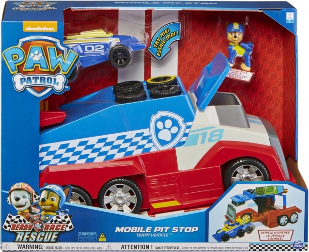 Chase je připraven zasáhnout! Mobilní vozidlo PAW PATROL se během chvilky změní na závodní velitelství. Po stisknutí transformačního tlačítka se otevře ovládací panel a odhalí integrovanou rampu s vystřelovačem, která vyšle závodní auto do akce. Dva horní tlačítka ve tvaru pneumatik aktivují realistické zvukové efekty a doplnění paliva pro ještě větší zábavu.