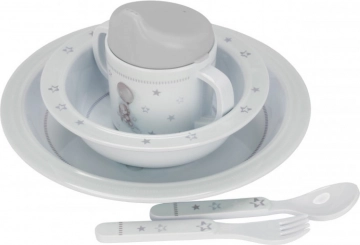 Tento set je vytvořen s ohledem na malé děti, jeho design je přizpůsoben pro snadné držení a používání. Protiskluzová guma na dně talíře, misky a hrnku pomáhá držet nádobí pevně na místě během jídla, což podporuje samostatnost při jídle.