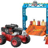 Natáhni, pusť a sleduj, jak vůz vyrazí přes oranžovou rampu a prolétne bránou s lebkou. Skvělá akční zábava bez baterií.