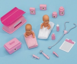 Součástí balení je vše, co malí lékaři a lékařky potřebují: stetoskop, otoskop, teploměr, injekční stříkačka, lahvičky na krmení, vanička a váha pro novorozence, i stůl s lampou jako vyšetřovací prostor. Tato hračka rozvíjí jemnou motoriku, sociální dovednosti a podporuje role-play se silným důrazem na péči o druhé.