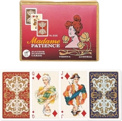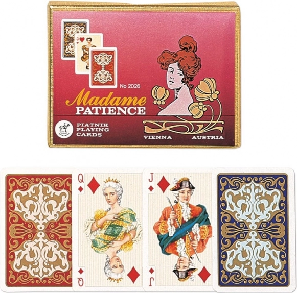 Pasjansové karty 'Madame' jsou navrženy tak, aby uspokojily i nejnáročnější hráče díky svému sofistikovanému vzhledu a praktické konstrukci. Každý balíček skrývá 55 plastifikovaných karet, což zaručuje jejich dlouhou životnost a odolnost vůči opotřebení.