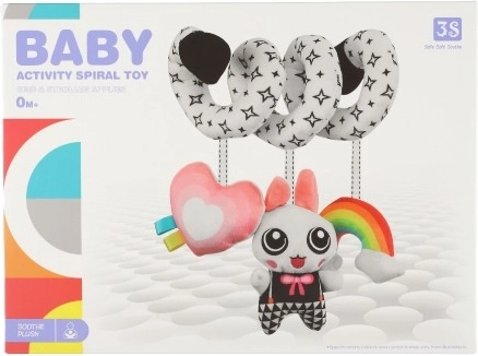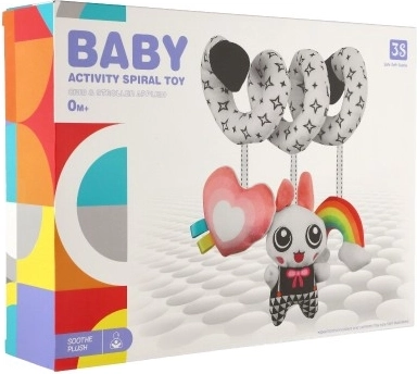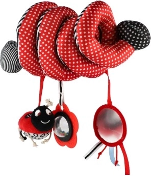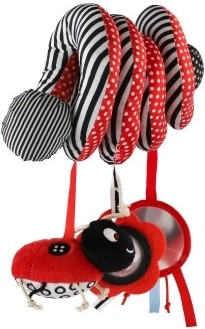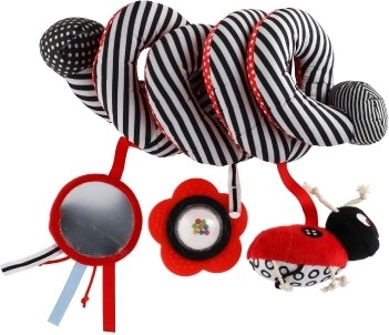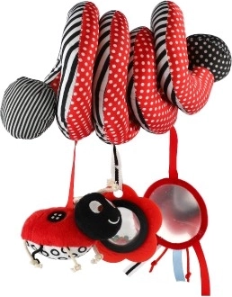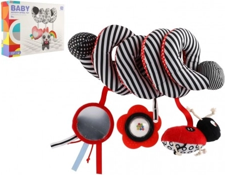 Krásná plyšová hračka na postýlku v kontrastních barvách pro vaše miminko. Hračka s chrastítky a zrcátkem napomáhá při rozvíjení smyslového vnímání dítěte a podněcuje jeho fantazii. Díky spirálovitému tvaru se dá upevnit na postýlku, autosedačku nebo ke kočárku.