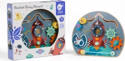 Dřevěná manipulační tabule ve tvaru rakety od CLASSIC WORLD nabízí 6v1 zábavných aktivit pro děti od 12 měsíců: labyrint, korálky, otočné kolečko, tlačítka, magnetický prvek a otáčecí knoflíky. Podporuje jemnou motoriku, koordinaci oko–ruka a kreativitu, je vyrobena z kvalitního dřeva a barvena netoxickými barvami.