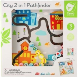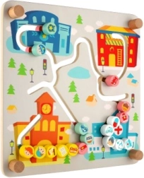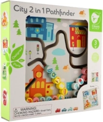 Tento kvalitní dřevěný labyrint nabízí dvě vzdělávací scény v jednom. Na městské straně děti vedou vozidla a postavičky po vyfrézovaných trasách k nemocnici, hasičům či policii, přičemž procvičují orientaci v prostoru, plánování a trpělivost. Barevná grafika a jasně značené cesty motivují k samostatné hře i spolupráci s rodiči.