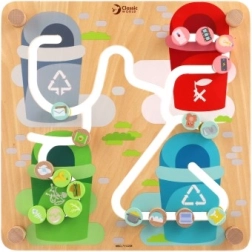 Druhou stranu tvoří recyklační téma, kde si děti hravou formou osvojují základy třídění odpadu a přiřazují předměty ke správným kontejnerům. Díky oboustranné desce tak přirozeně vzniká dialog o ochraně přírody i fungování města. Pevné dřevěné provedení (30 × 30 cm) a hladké, zaoblené hrany zajišťují bezpečí i dlouhou životnost.