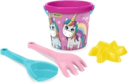 Kompletní set: kbelíček, lopatka, hrabičky a formička pro tvorbu báboviček a hradů z písku.