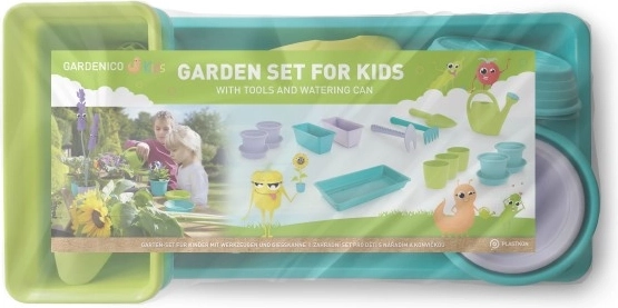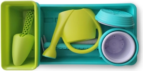 Součástí balení jsou květináče různých velikostí, minitruhlíčky i praktická konvička a nářadí, takže děti mohou zasévat, přesazovat i zalévat jako opravdoví zahradníci.